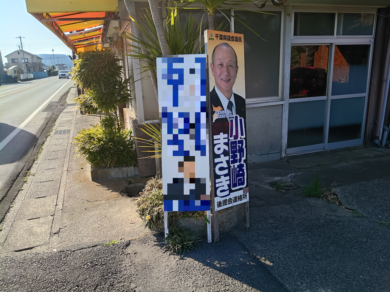 山武市内に設置されている小野崎県議の政治活動用看板について、公職選挙法施行令で定められたサイズ規定を超過していることが分かった。