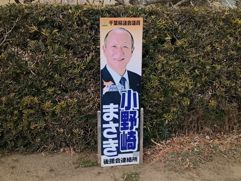 山武ジャーナルは2月16日、小野崎県議の政治活動用看板が、公職選挙法施行令で定められた高さ150センチ以内という規定を約30センチ超過していることを報じた。