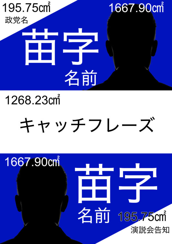 今回のご指摘では、演説会告知部分だけではなく、政党名やキャッチフレーズも含めて1/3と考えるべきではないか、とのことでした。そこで実測値をもとに、それぞれの部分の面積を算出しました。