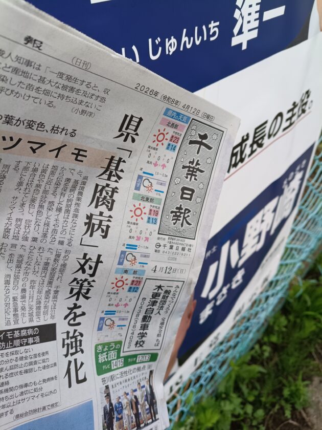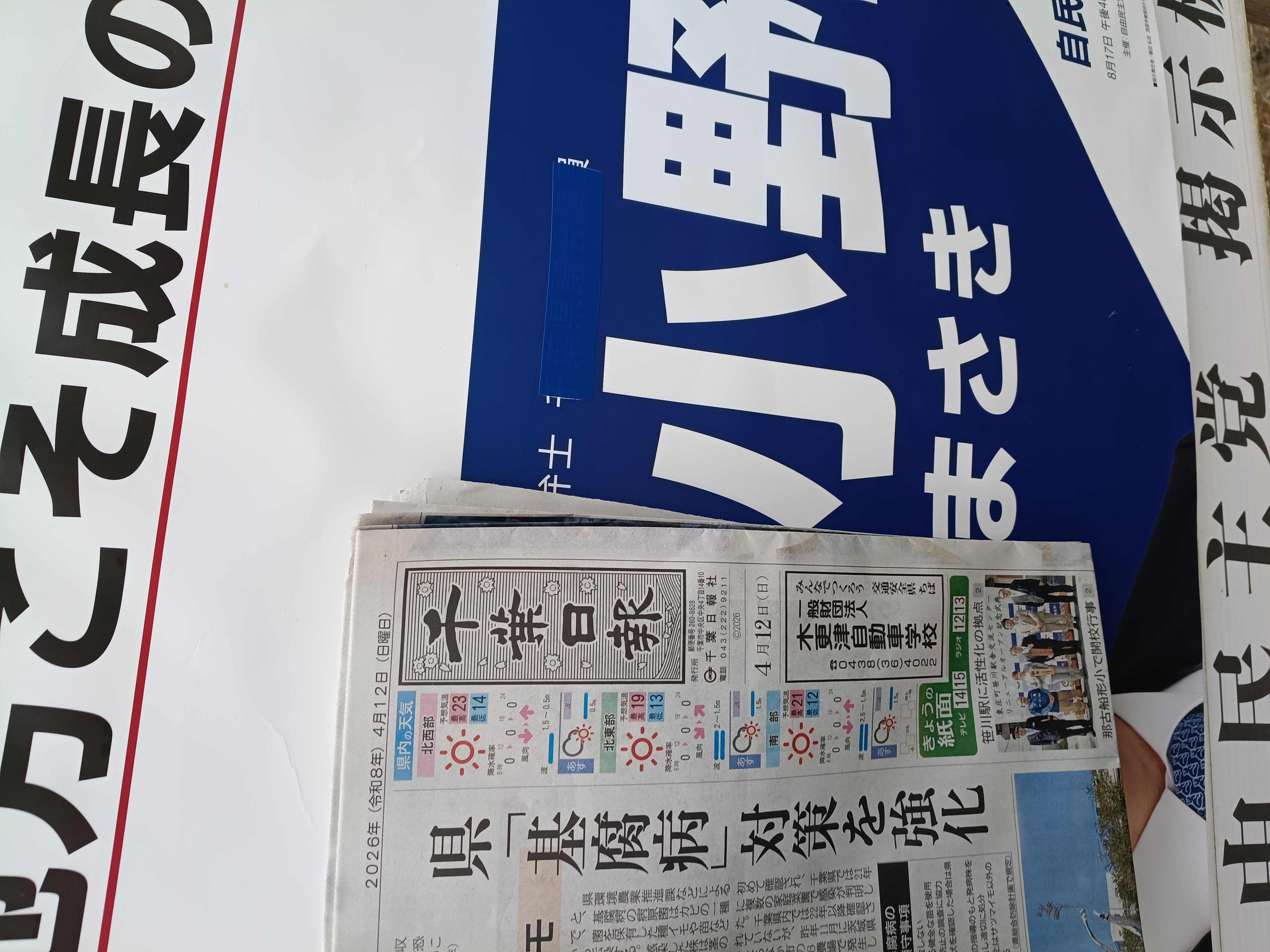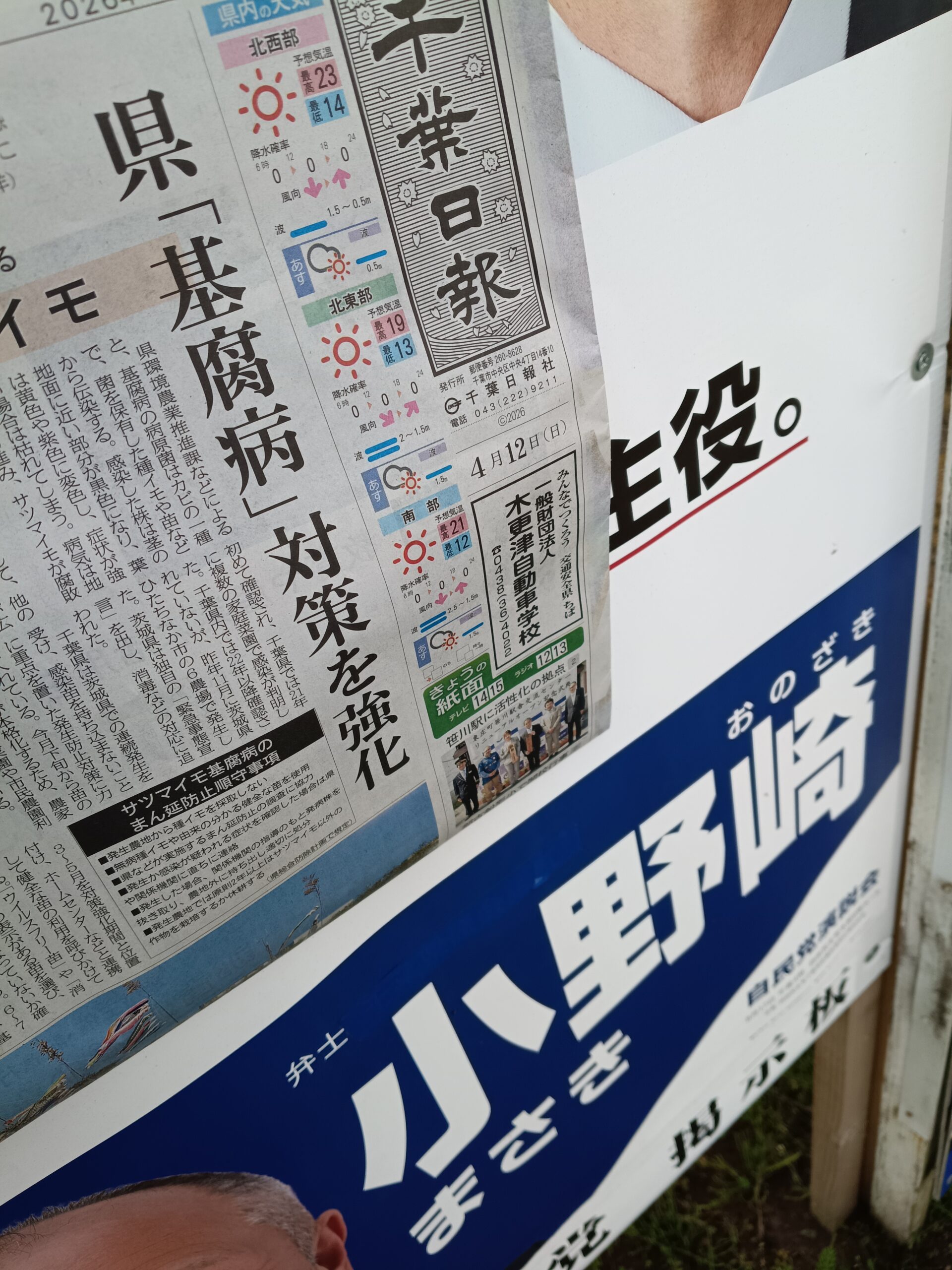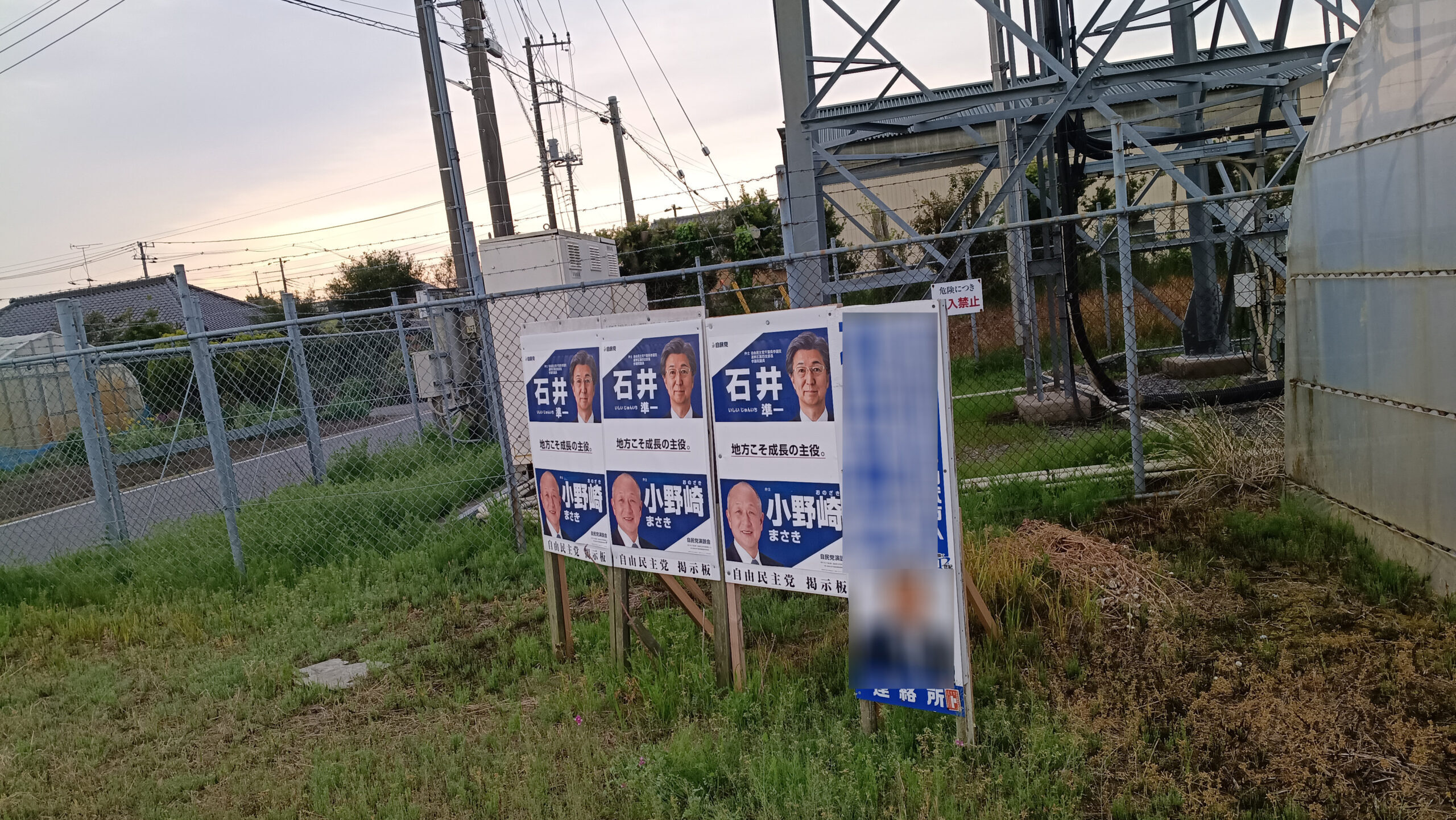 本日4月12日に告示された山武市長選挙において、告示日当日早朝の時点で、市内複数箇所において政治活動用ポスターの掲示が継続されている状況を確認した。