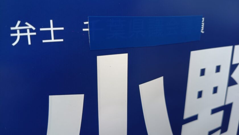 掲示されていたすべてのポスターの「千葉県議会議員」の部分を、背景と同色の青いテープで隠し、そのまま掲示が継続されたのである。