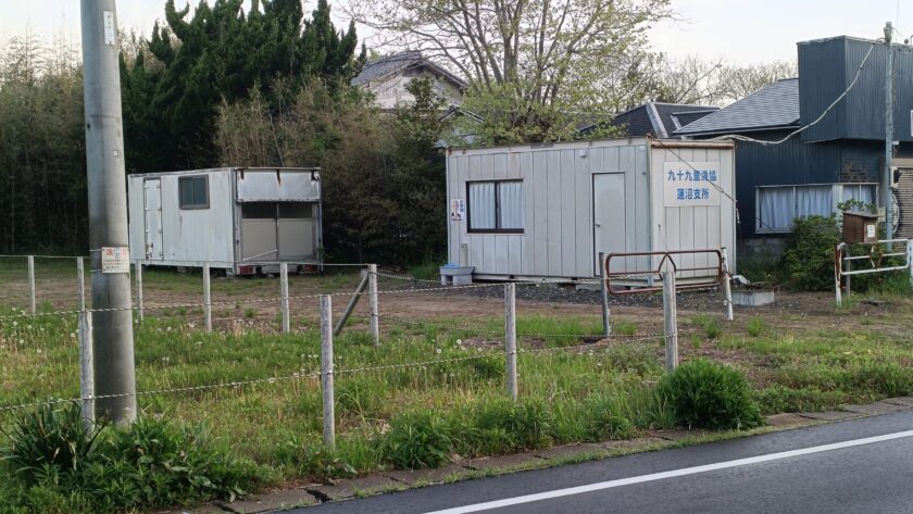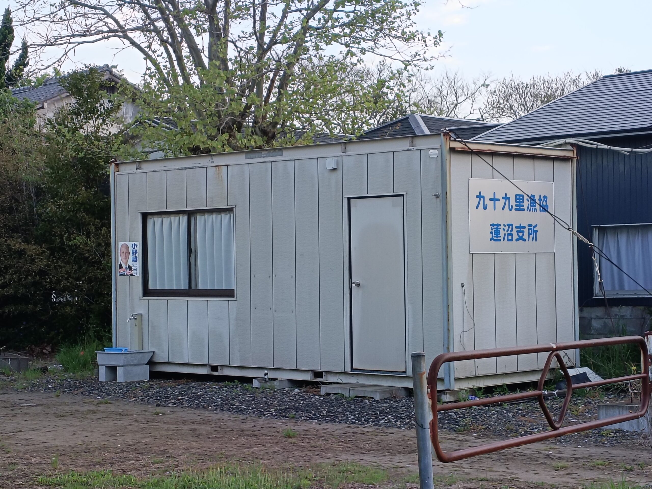 小野崎氏の選挙ポスターが掲示されていたのは、山武市蓮沼ロ2835付近、県道30号線(通称飯岡一宮線)沿いの「九十九里漁協蓮沼支所」と表記のあるコンテナハウスの外壁で、県道から十分に目視できる位置。