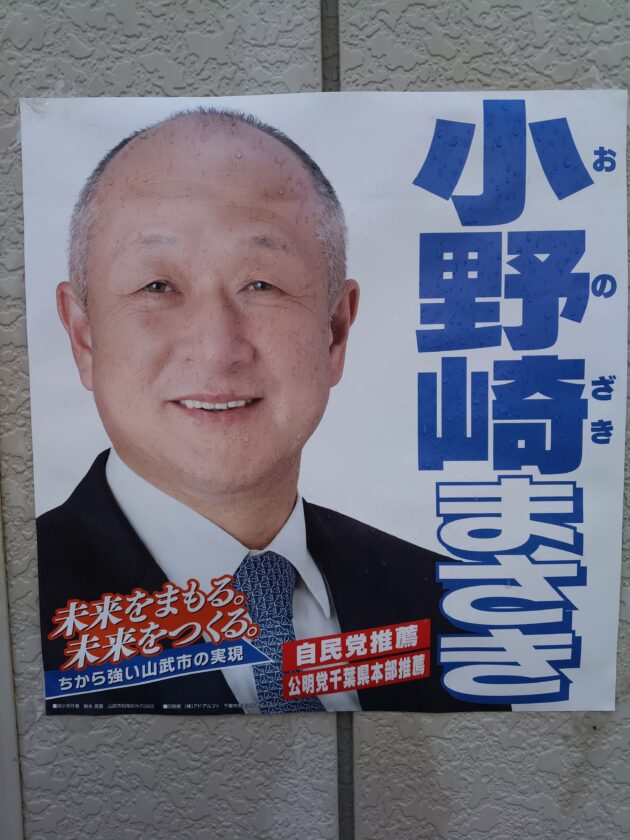 4月19日投開票の山武市長選挙で、7,963票を獲得して当選した小野崎正喜前千葉県議の選挙ポスターが、公設掲示板以外の場所に、2日後の4月21日まで掲示されていたことが確認された。